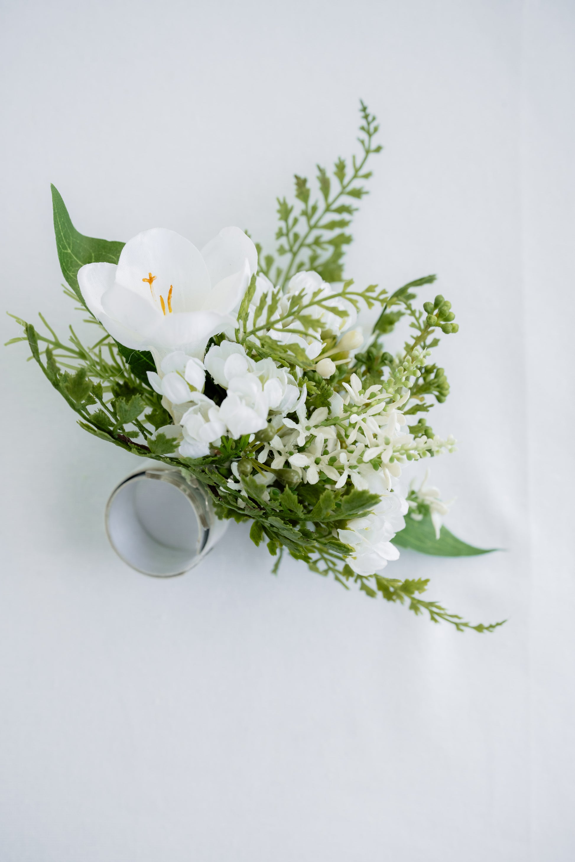 Featuring a hand-selected mix of lifelike hydrangeas, wax flowers, dahlias, lily of the valley, freesia, echinacea, and other premium silk greenery, the Savannah Collection brings an elevated, natural elegance to your celebration. Each arrangement is beautifully finished with silky white satin ribbon for a refined bridal touch.